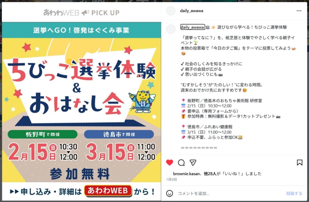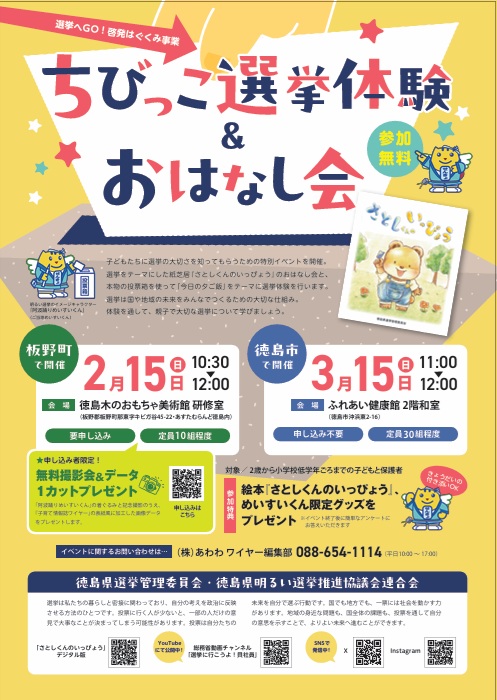 イベントは「ちびっこ選挙体験&おはなし会」と題し、学生ボランティアによる紙芝居おはなし会や、本物の選挙箱を使った投票体験、「めいすいくん」や「すだちくん」と一緒に行う開票タイム、キャラクターたちとの撮影会など、親子で楽しみながらも選挙を身近に感じてもらえる工夫を盛り込んだ。参加したお子さんには、選挙をテーマにした絵本やシールなどのプレゼント。