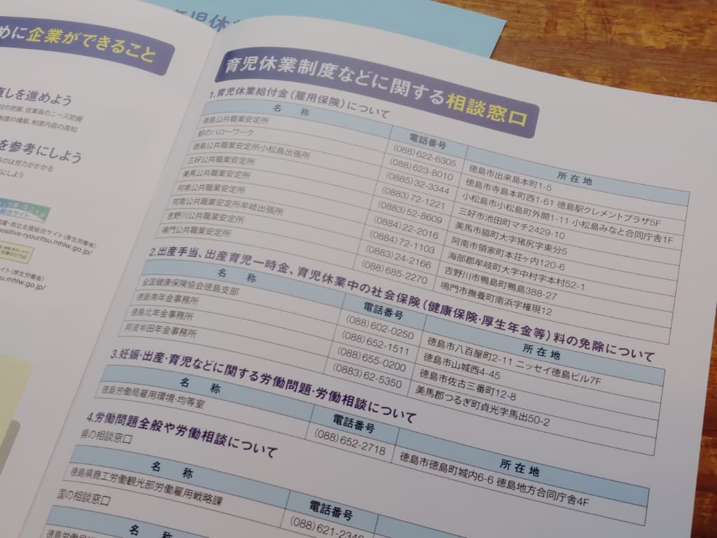 ほか、男性育休に関する相談窓口なども掲載し、徳島県内の経営者層を中心に活用してもらえるような冊子を制作した。