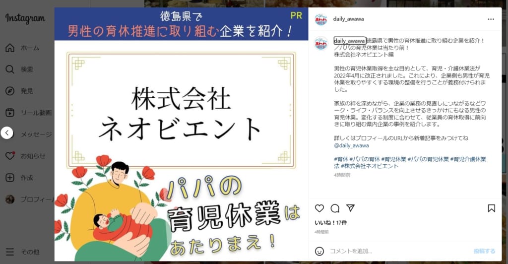 「あわわ公式フェイスブックでの投稿および有料広告の配信」「あわわ公式インスタグラムでの投稿」「あわわ公式ツイッターでの投稿」を実施。前述の冊子の流通を補足する形で、いっそうの男性育休の促進を目指した。