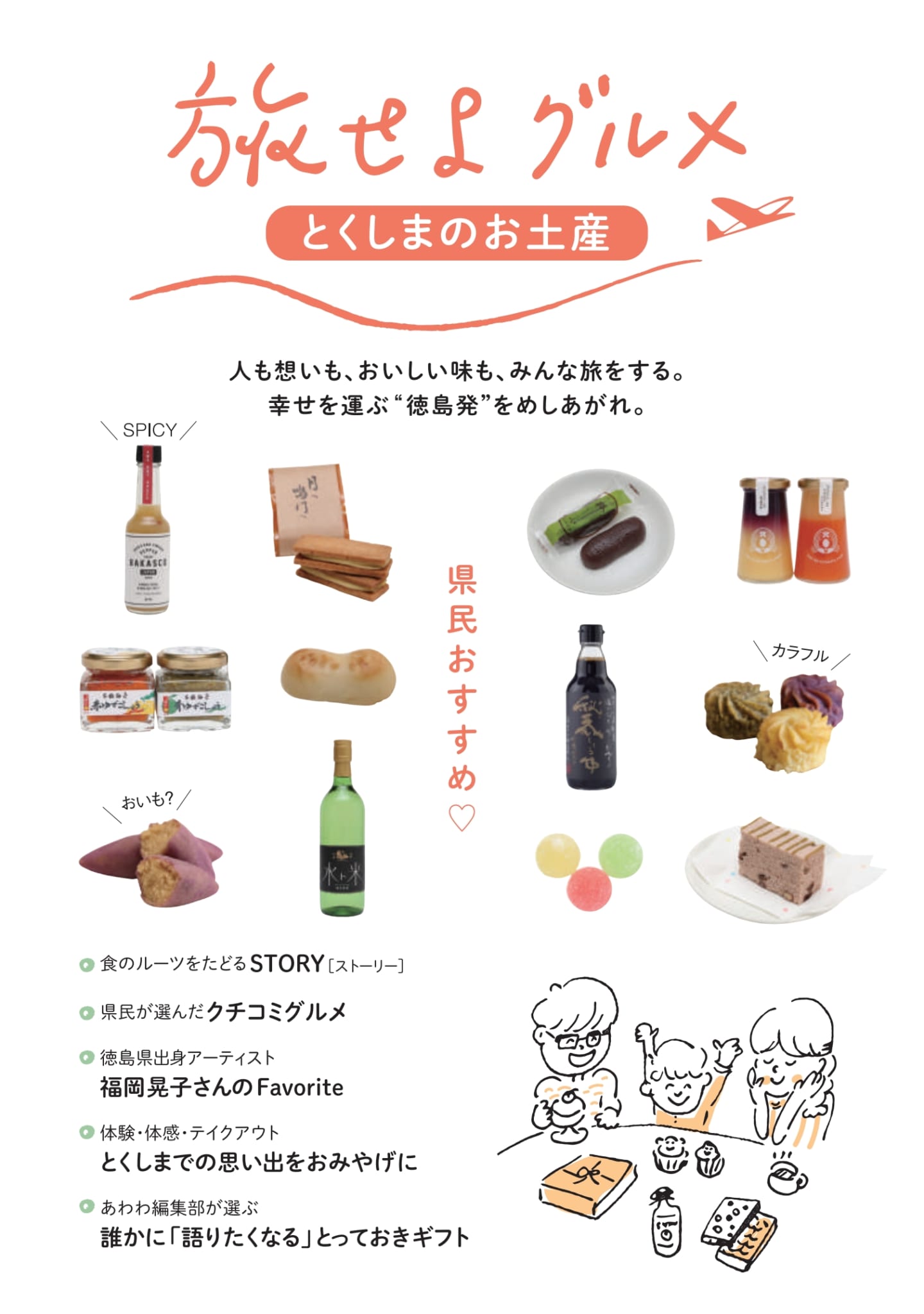 県外から徳島を訪れる方々に、魅力的なとくしまのお土産を発信するパンフレット制作を請け負いました。またこのパンフレットの周知を促すべく、PR記事・キャンペーンポップやポスターの制作もあわせて請け負いました。