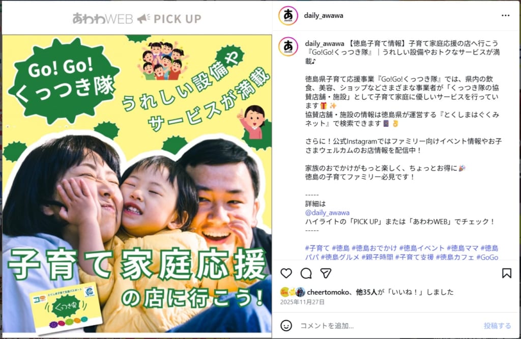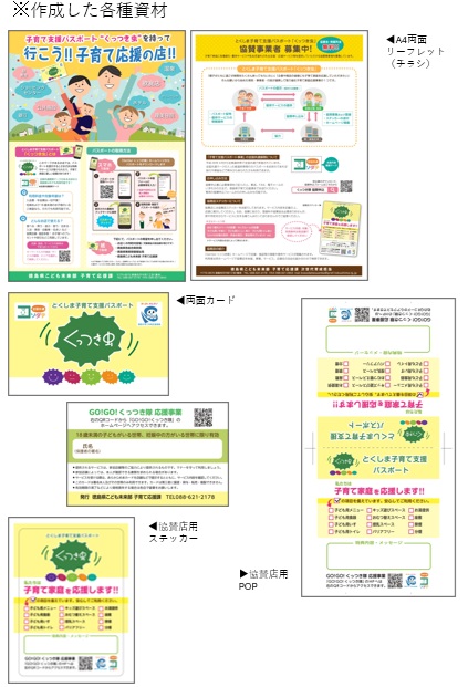 徳島県が運営している「子育て支援パスポート(Go!Go!くっつき隊)事業」について、協賛店の増加、子育て世帯への広報(SNS投稿やリーフレット類の制作)などを行い、社会全体で子育て世帯を支援する機運の醸成を図る、という目的のもと、弊社の各種メディア「子育て情報誌ワイヤー」「タウン誌あわわ」「あわわWEB」などの取材時に収集した情報をもとに、同パスポートへの協賛交渉を実施。